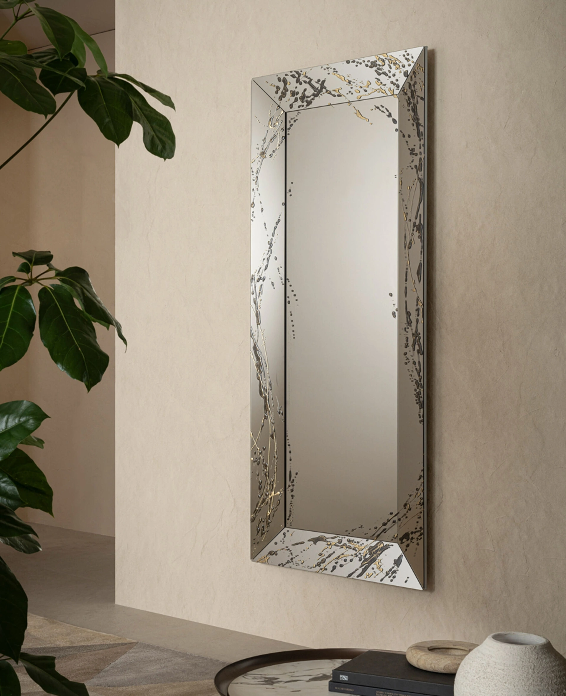 Particolarmente versatili e multifunzionali, i Complementi design in vetro assolvono a funzioni differenti: ultimano le doti pratiche e il valore estetico dell'ambiente. Complementi e specchi completano l'arredo di casa, occupando lo spazio in maniera utile e rendendolo assai funzionale e bello a vedersi. Specchio con cornice in cristallo inclinato con decorazione a rilievo Trapezio Art di Riflessi in vetro: aggiungerà carattere e fascino a un interno arredato con mobili e oggetti accessori dai richiami design. Le composizioni di charme del brand Riflessi rendono belli l'habitat con i loro colori e stile, ricreando peculiari atmosfere arredative.
