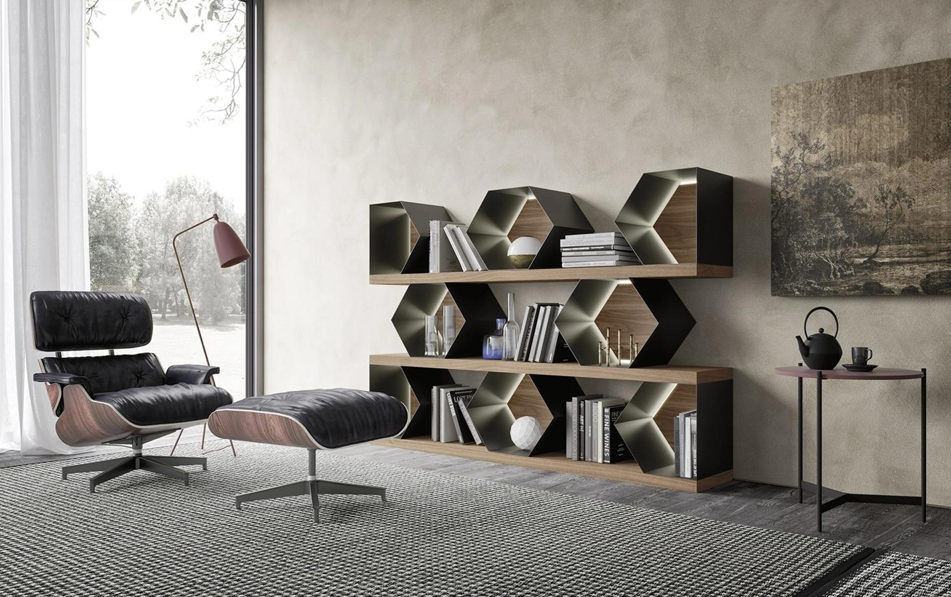 La Libreria Horizon Esagoni 977 di Mobilgam nell'immagine, nella variante in legno, è davvero funzionale e versatile, robusta e durevole, nonché caratterizzabile seguendo le più particolari problematiche abitative. Le Librerie a muro Mobilgam sono disponibili in differenti forme: ad angolo, in linea, sospese e realizzabili su misura con molteplici accessori, mensole e vani. Le Librerie design sono sempre tanto amate per organizzare la zona giorno e le pareti, unendo alla perfezione doti di funzionalità e stile.