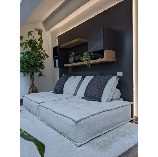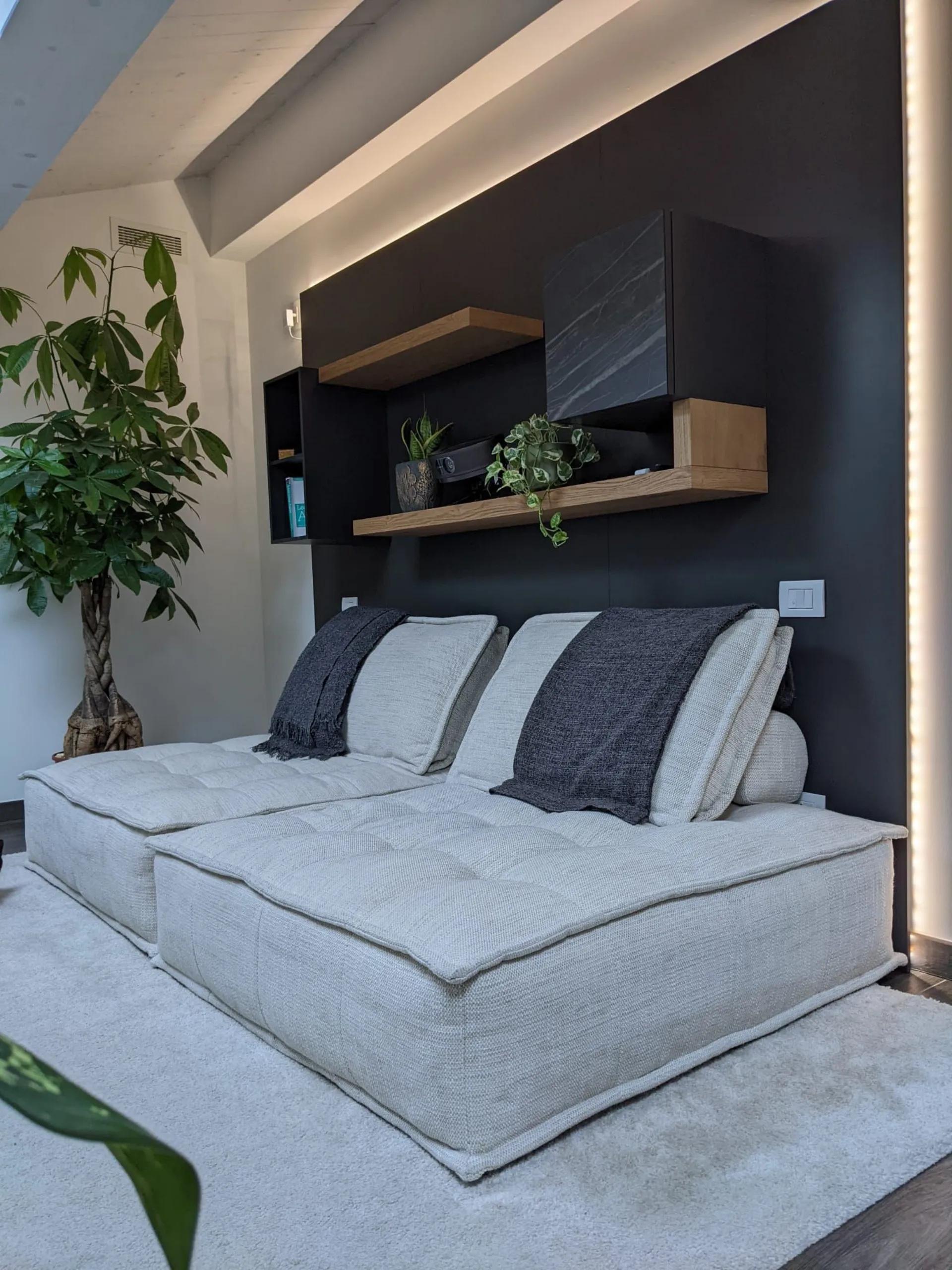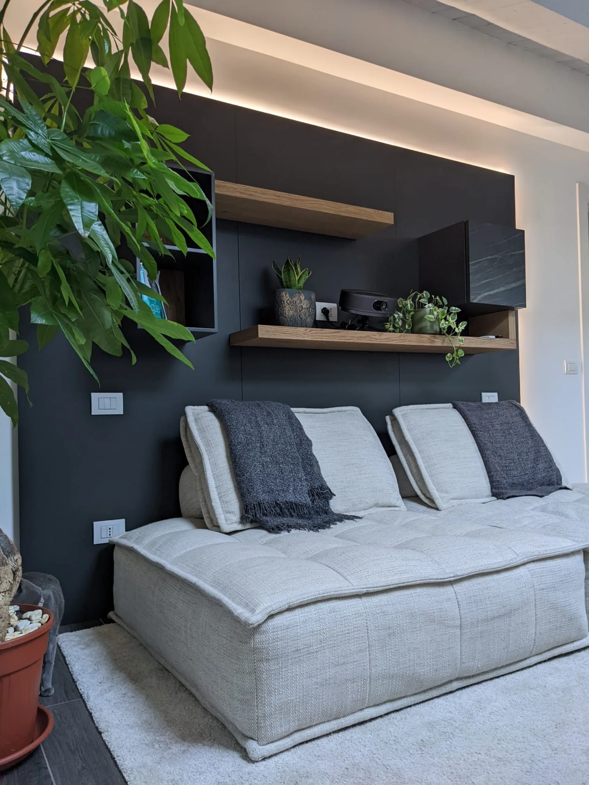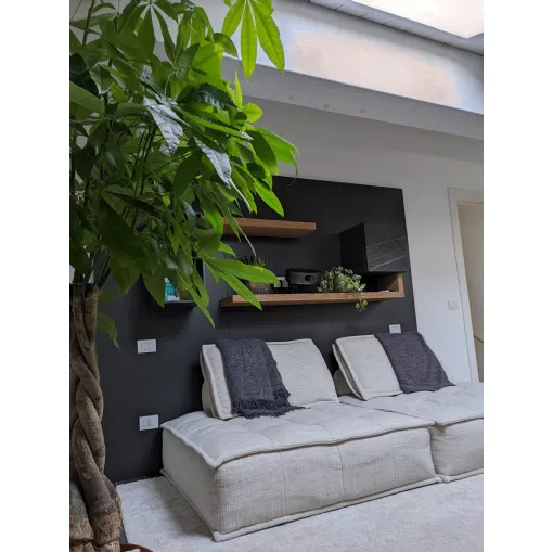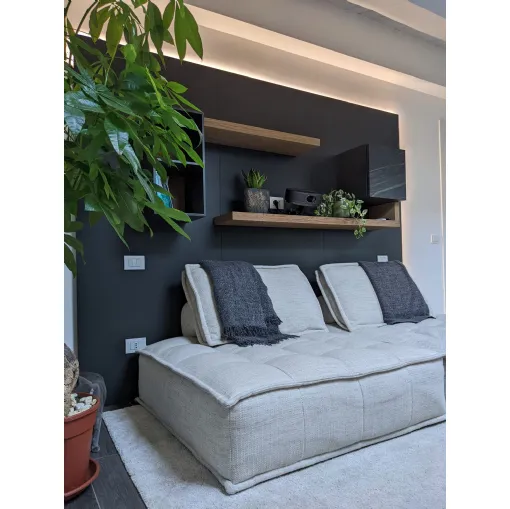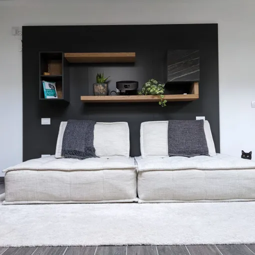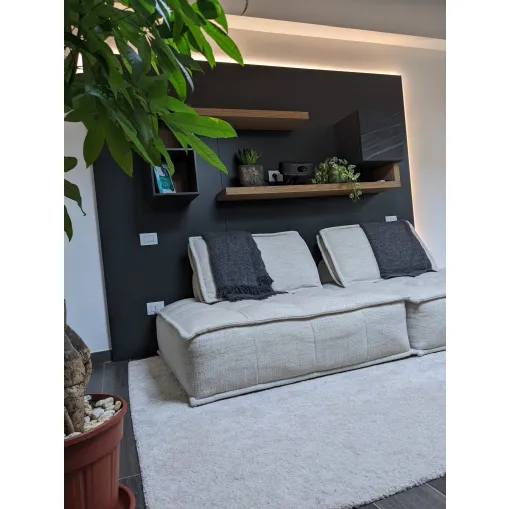 La disposizione degli elementi sospesi è stata studiata per garantire una comoda seduta ed il giusto collocamento del proiettore per l'home cinema. I pannelli retrostanti, usati come sistema di supporto per mensole e pensili, trovano integrato anche il sistema di retroilluminazione per godersi al meglio l'esperienza. Le finiture a contrasto e l'anta in ceramica con le venature che riprendono le tonalità calde del legno aiutano a conferire eleganza alla composizione.
