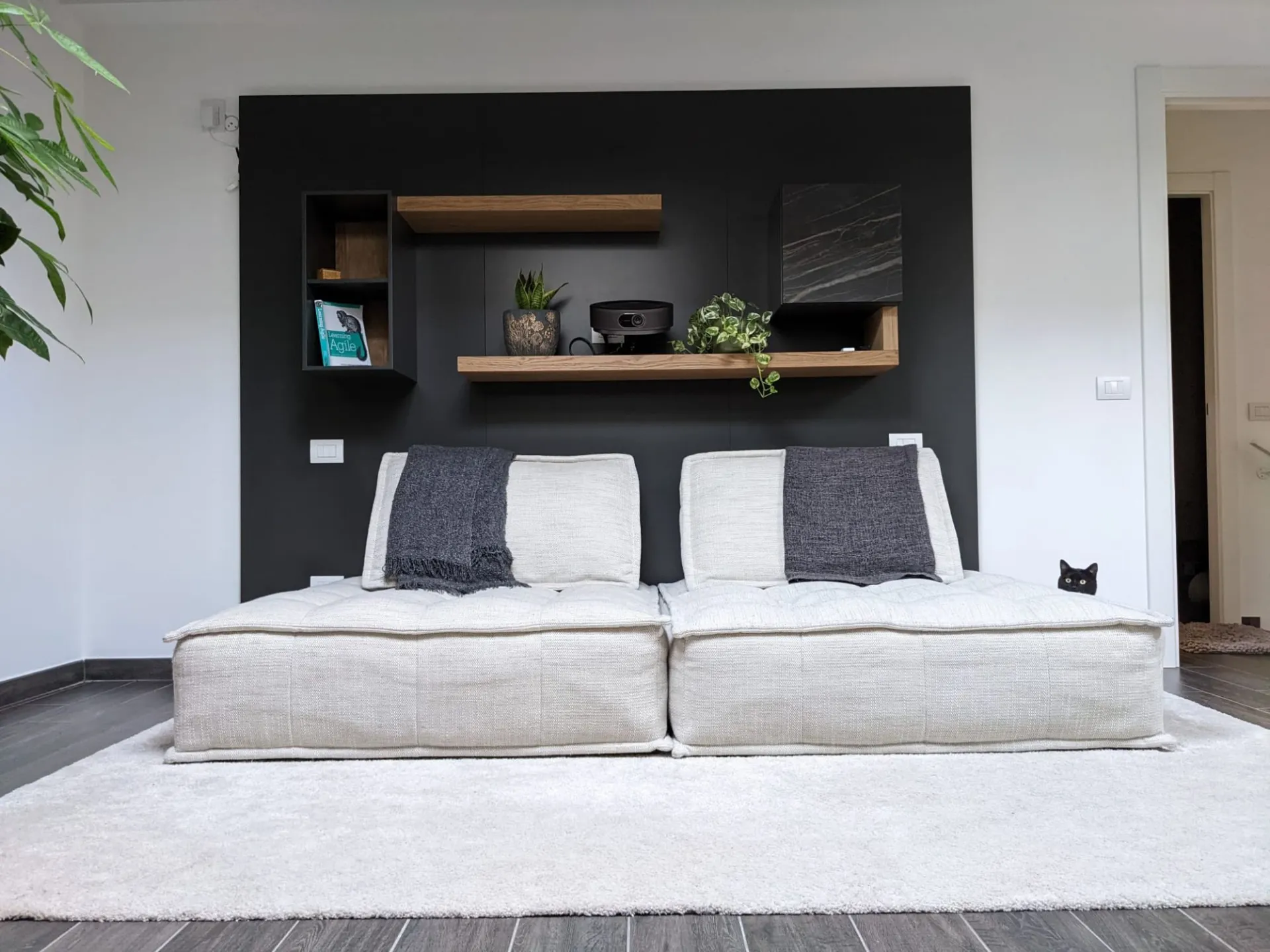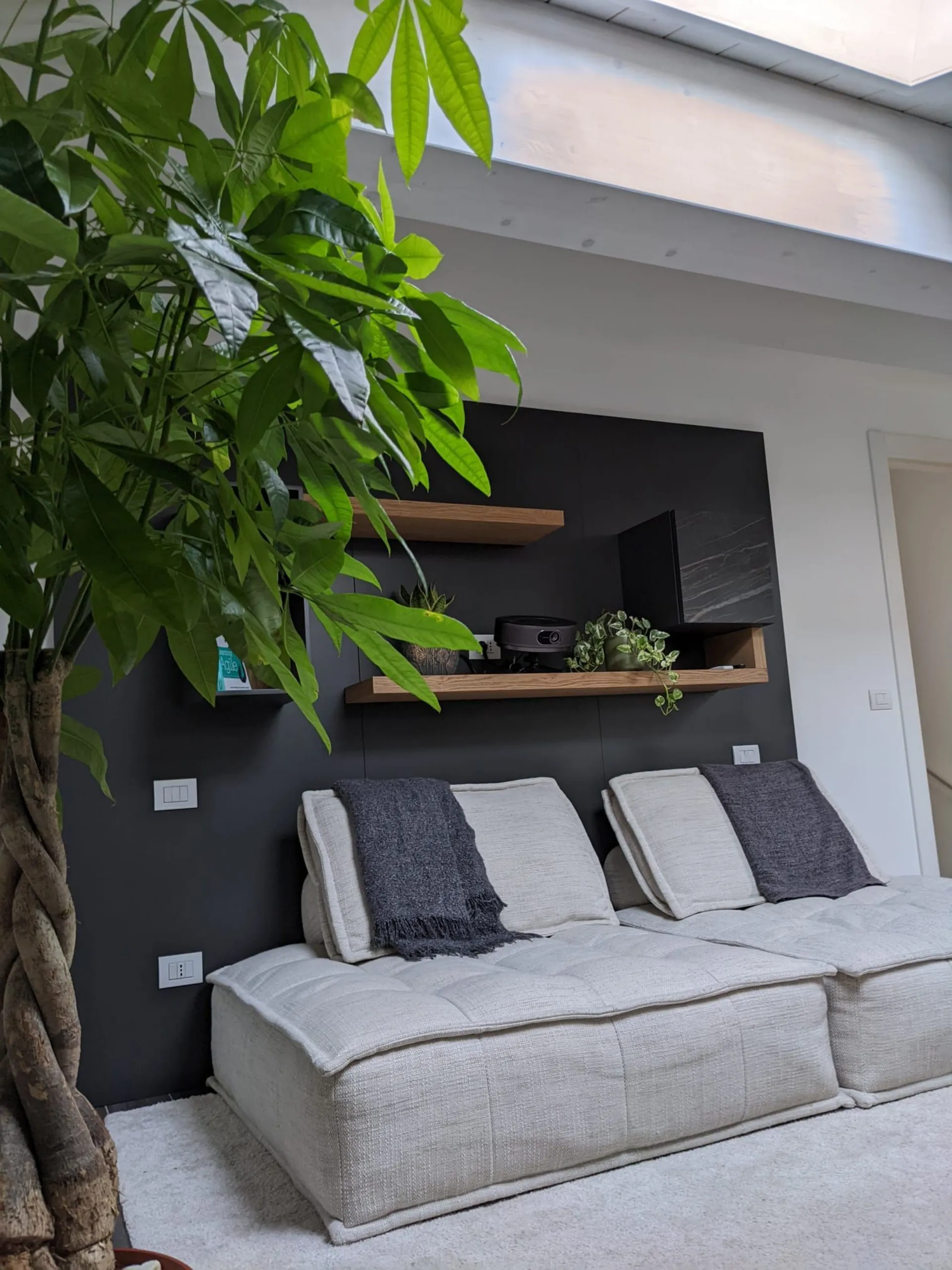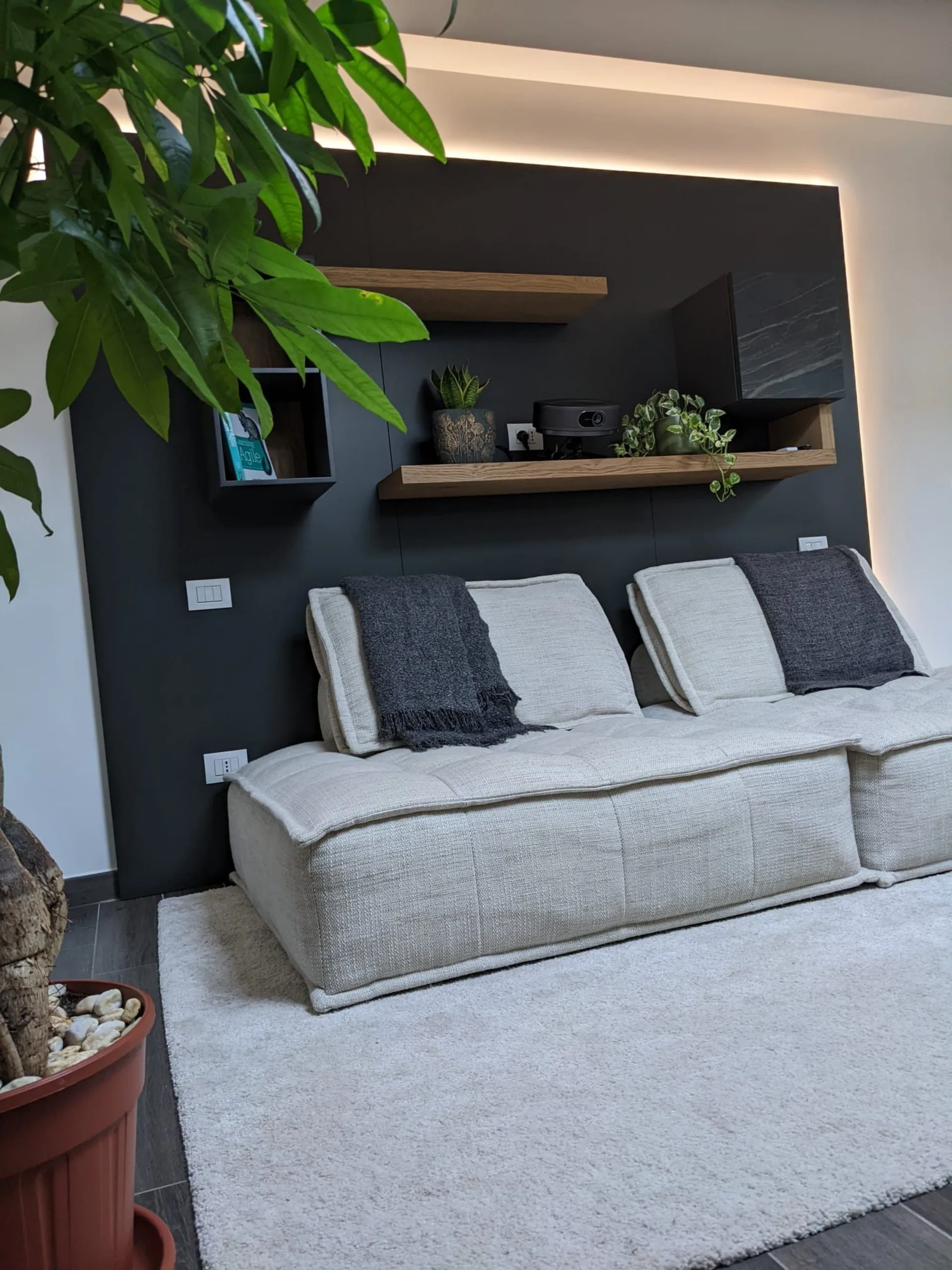 La disposizione degli elementi sospesi è stata studiata per garantire una comoda seduta ed il giusto collocamento del proiettore per l'home cinema. I pannelli retrostanti, usati come sistema di supporto per mensole e pensili, trovano integrato anche il sistema di retroilluminazione per godersi al meglio l'esperienza. Le finiture a contrasto e l'anta in ceramica con le venature che riprendono le tonalità calde del legno aiutano a conferire eleganza alla composizione.