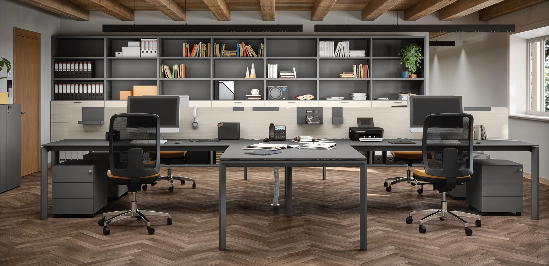 Materiali di prima scelta, una buona resa estetica e design unico contraddistinguono la ricca collezione di mobili per gliambienti lavorativi del brand Cinquanta3. Al giorno d'oggi l’Arredo Ufficio deve accontentare le esigenze di funzionalità e comfort per chi svolge il lavoro, quelle di accoglienza e serietà innanzitutto per i clienti. Mobile Ufficio Libreria 04C di Cinquanta3: ideale per completare glispazi lavorativi salvaguardando la comodità di chi ci lavora, con una buona resa estetica. Nel nostro showroom proponiamo diverse composizioni arredative con librerie per ufficio Cinquanta3 in melaminico, sempre in materiali di prima scelta e resistenti nel tempo.